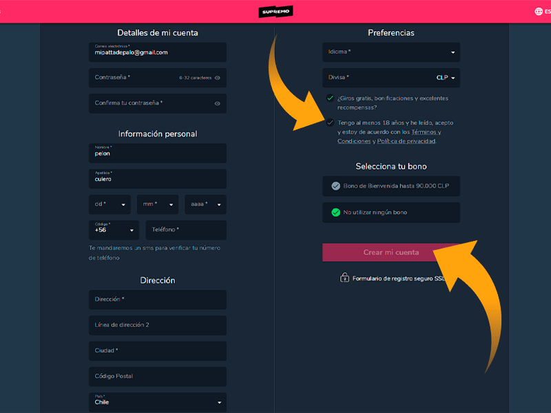 Al procesar tu Registro en Supremo Chile, te permites generar una cuenta nueva, con todos los beneficios (y responsabilidades) que eso conlleva. Entonces, te contaremos el paso a paso, sobre todo lo que deberás hacer durante tu Registro en Supremo Chile. Recuerda leer bien la información ingresada, antes de avanzar hacia el siguiente paso y confirmar tu cuenta.