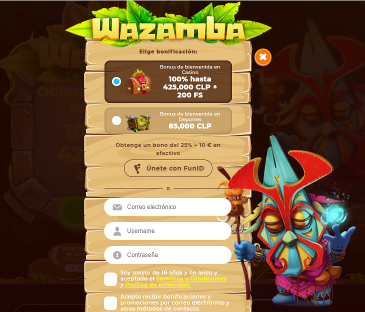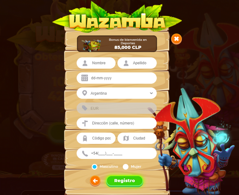 Después de elegir tu «héroe» (unos simpáticos personajes de Wazamba), tendrás que completar tus datos en el formulario. Antes que eso, deberás seleccionar la promoción de Bienvenida a la que quieres aplicar con tu registro en Wazamba (Apuestas o Casino). Los datos a completar son: